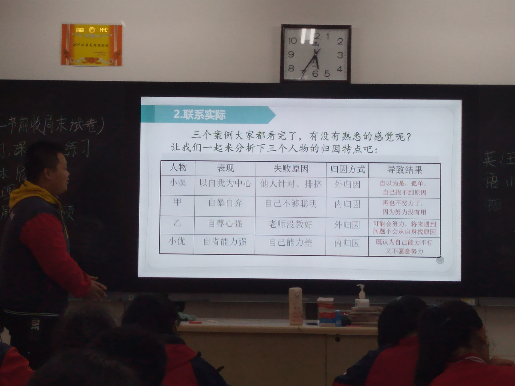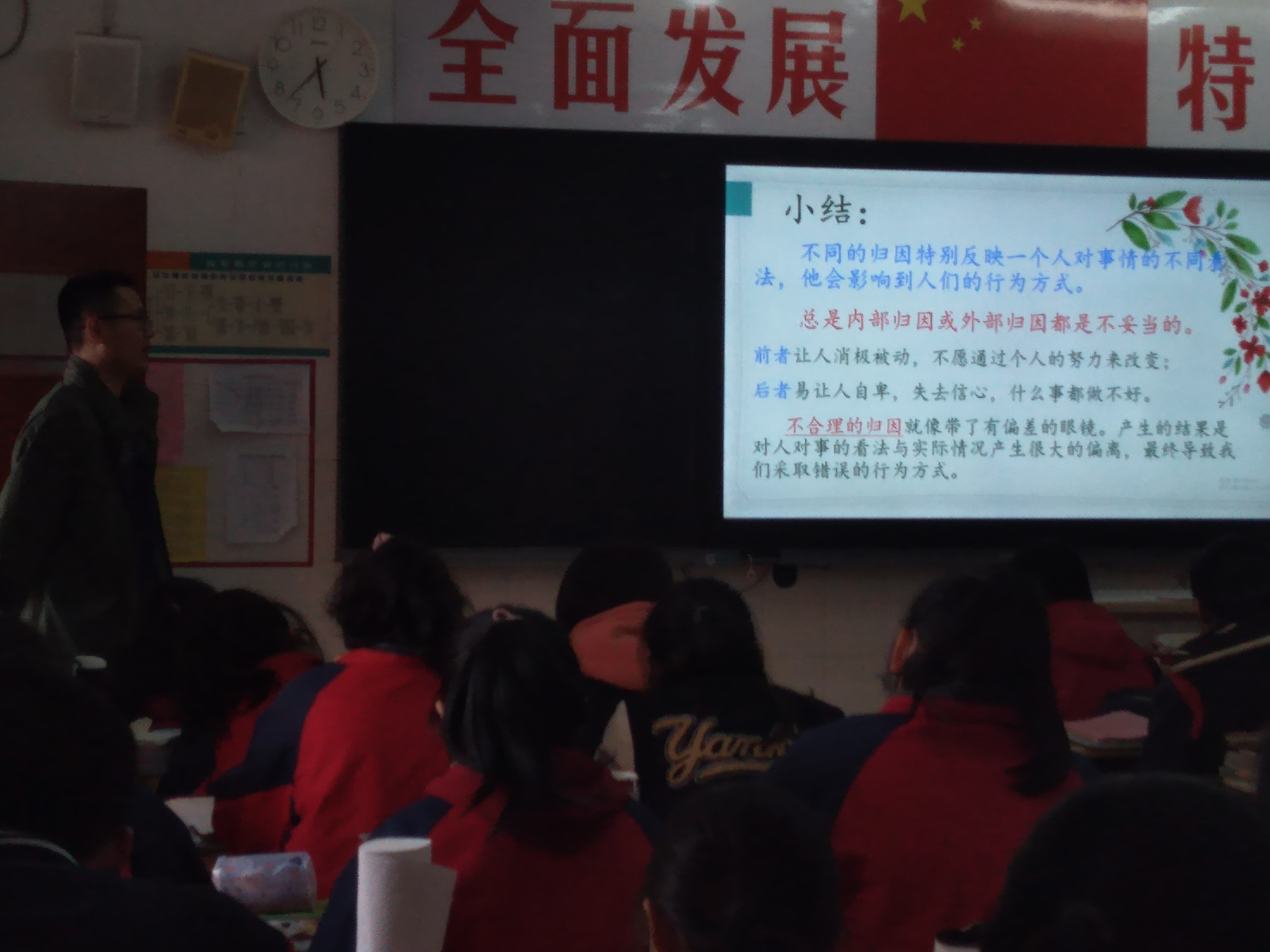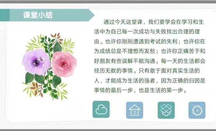 一个人把自己的成功或失败归因于什么,这会影响到今后行为的发展。若把失败归因于能力不足,则当这个人在失败时一般不会再去争取胜利;若认为失败的原因是自己努力不够,则将倾向于通过更多努力以求成功。 现实中学生总是有意无意地在自己的学习、人际交往等出现问题时寻找原因,大部分学生习惯将责任推卸到别人身上,“只缘身在此山中”,看不到自己的缺点,这是一种严重的归因偏差行为。 学生对自己的归因方式不仅反映着他们寻找学习结果的倾向,而且还会影响到学生的学习动机,甚至影响到其人格特点。因此,2021年4月12日泰安一中青年路2019级部各班开展了一节别开生面的心理健康主题班会课——《合理归因益身心 阳光心态利成长》,帮助学生了解自己的归因类型,引导他们对自己学习成绩、人际交往等进行合理的归因,有效地激发了学生的学习积极性、学习动力,有助于培养学生良好的人格特征。